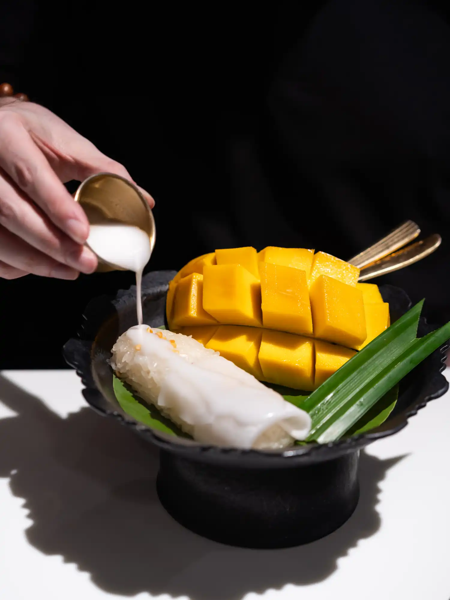 It is usually topped with crunchy yellow mung beans for texture and extra coconut cream on top. You can also find a variation made with durian instead of mango.