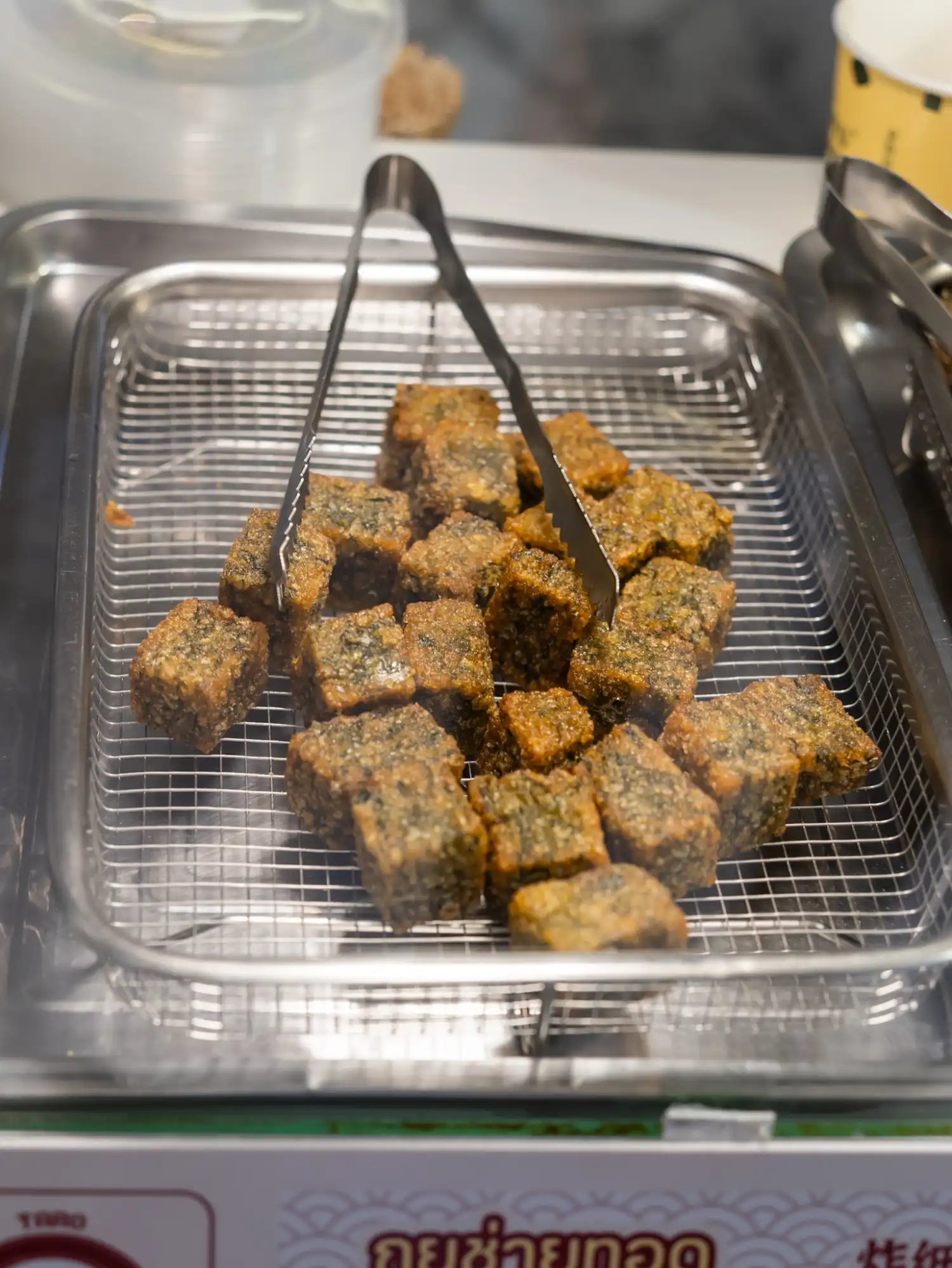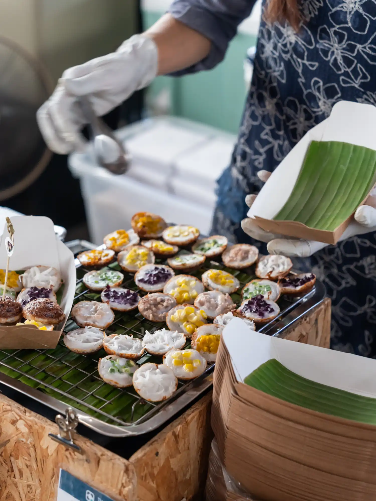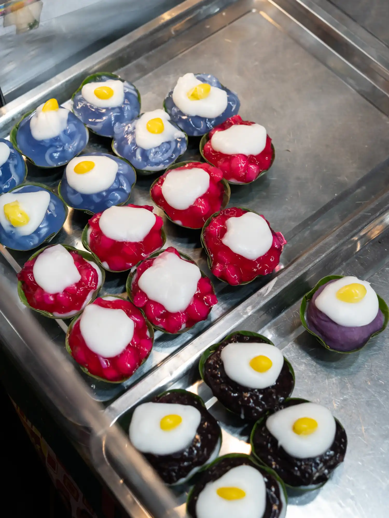 These are small, bite-sized coconut puddings with a crispy shell and a creamy coconut cream centre. They usually have two distinct layers: a crispy outer shell and a soft, creamy coconut cream centre that melts in your mouth. I tried a delicious mixed box at Jing Jai Market in Chiang Mai which came with various toppings pressed into the centre, such as sweet corn and purple taro.