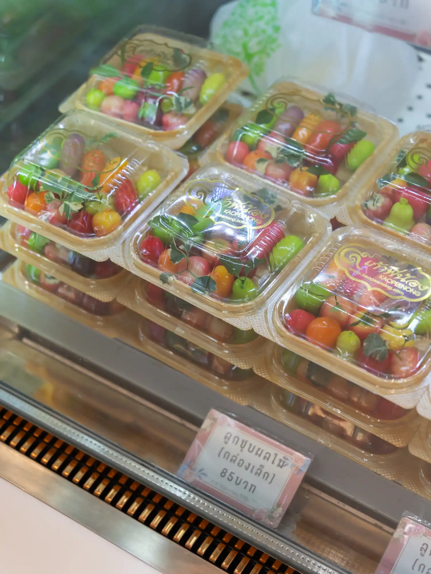 One of the most Instagrammable sweets you can find in Thailand. They look like beautiful, glossy miniature fruits and vegetables - think tiny chillies, mangos, and mangosteens. Despite looking like candies, they are actually made from sweetened mung bean paste that is moulded into shapes and coated in a shiny agar jelly glaze.