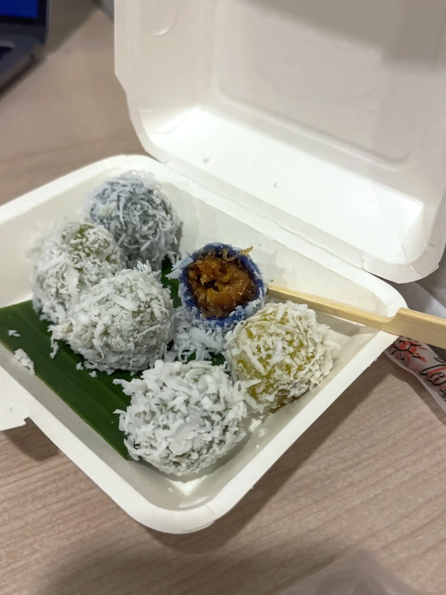 These are boiled rice flour dumplings stuffed with a caramelised coconut filling. The filling is made by cooking shredded coconut with palm sugar until it becomes a sweet, dark brown paste. The balls are then rolled in fresh shredded coconut. They have a chewy texture and a sweet coconut-y filling.
