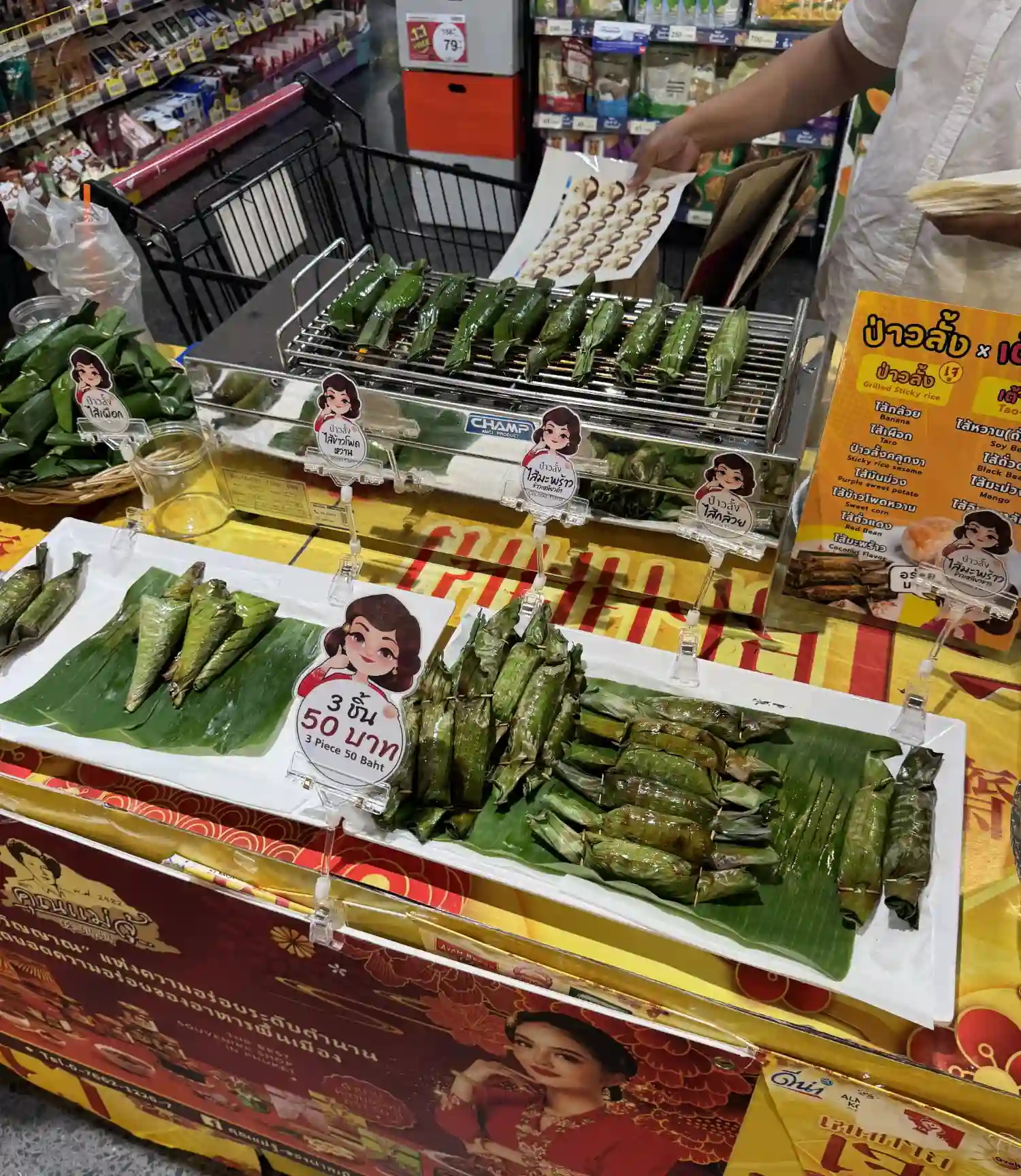 A long, thin treat made of sticky rice, palm sugar, various fillings, and wrapped in a palm leaf and roasted over charcoal.