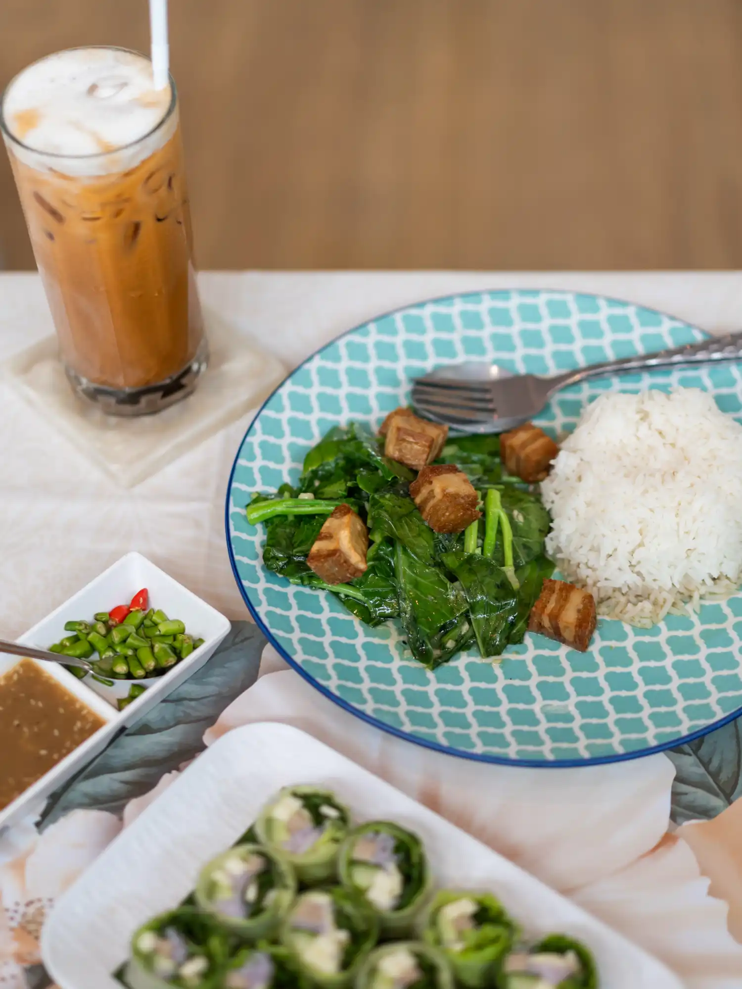 The menu features a great selection of classic Thai dishes made fully vegan. You can expect to find all the hits here, like pad kaprao (stir-fry holy basil pork) and pineapple fried rice. I had their Thai milk tea here which is fragrant and tasty.