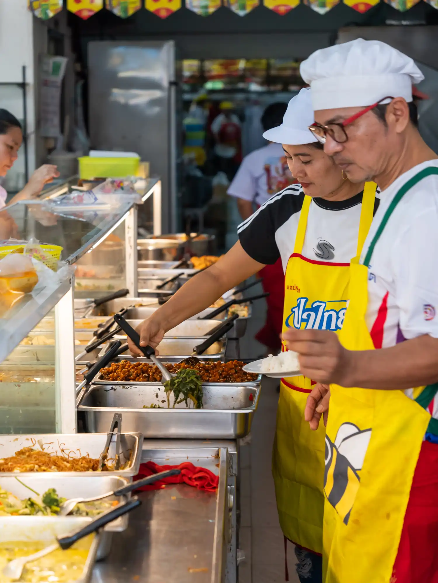 You will see the red and yellow "17" symbol (which looks like the number 17 but is the Thai word for "Jay") everywhere. This means the food is vegan (no meat, dairy, eggs) but also excludes pungent veggies like garlic and onions. It is the safest sign to look for when eating street food!