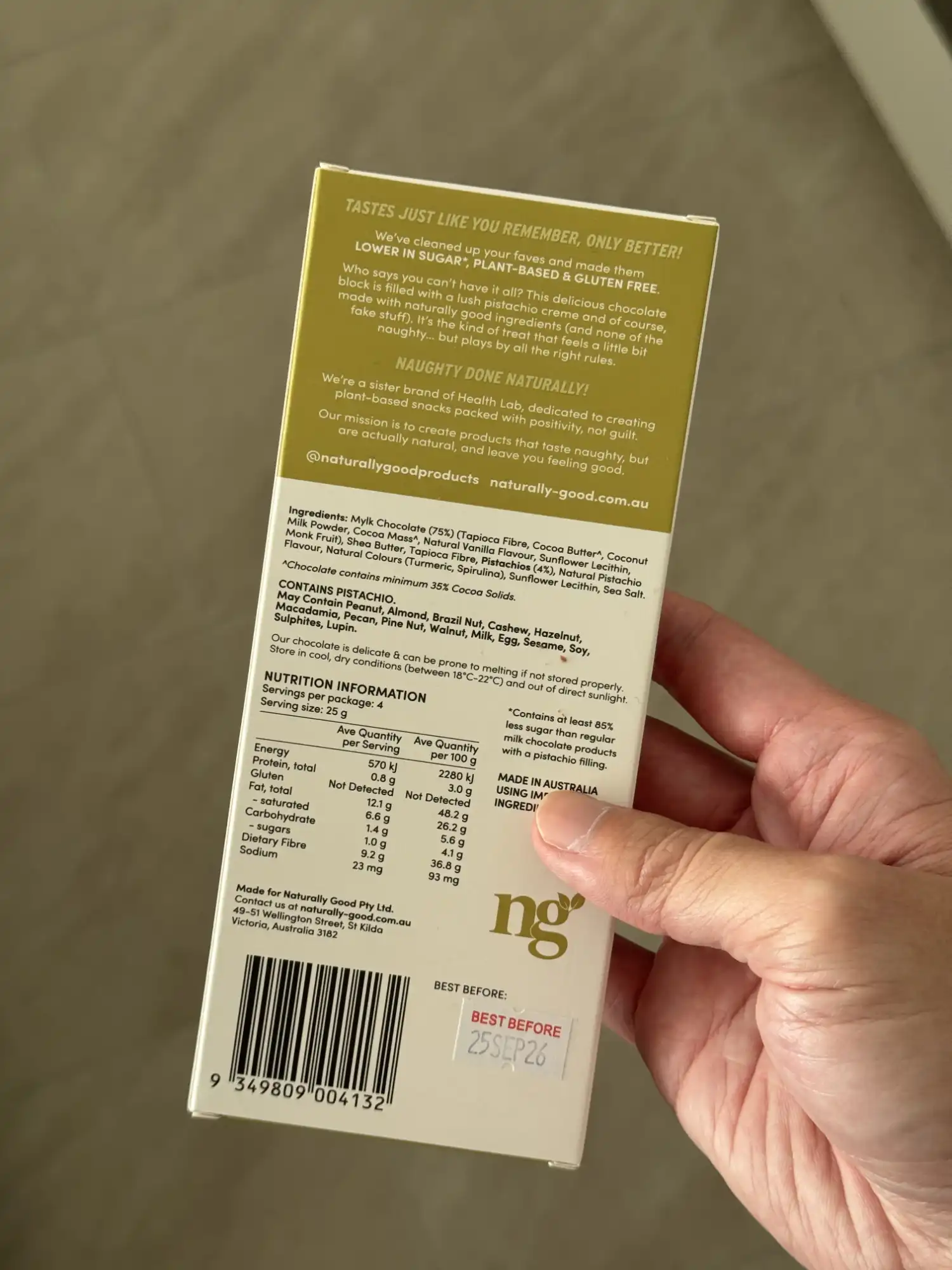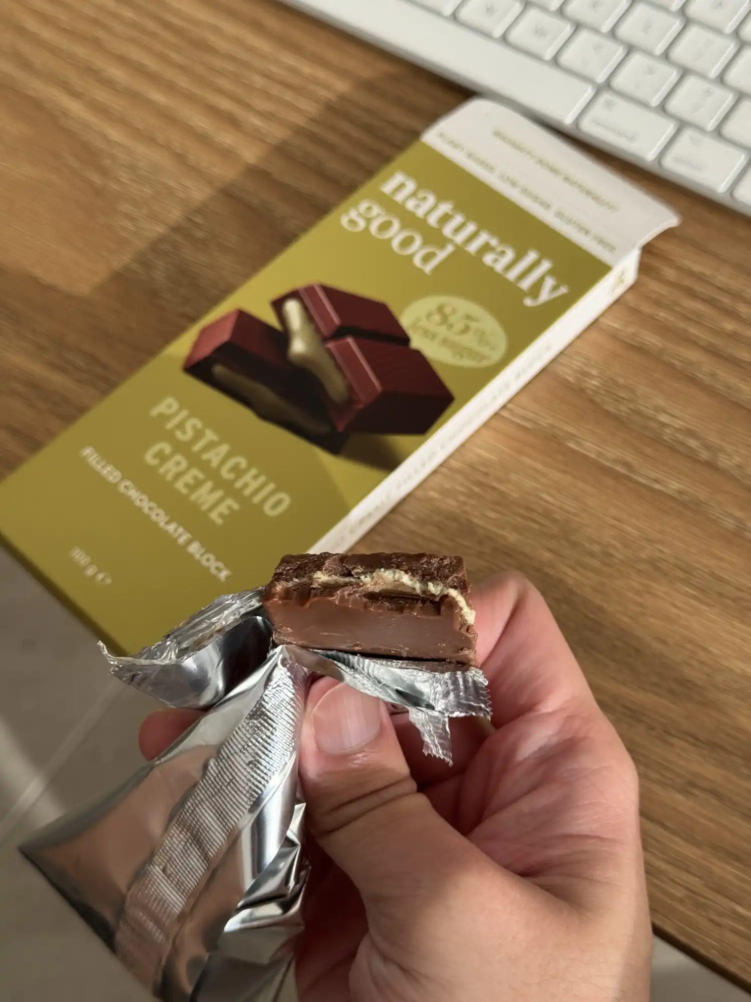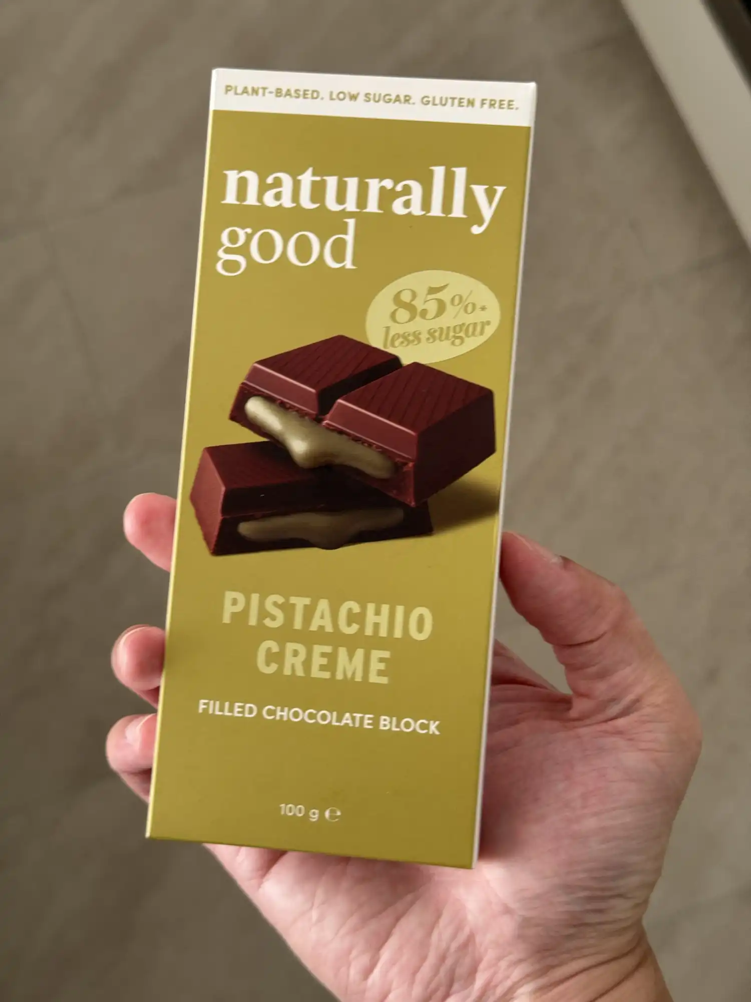This Naturally Good pistachio chocolate block was incredibly disappointing and, in my opinion, verged on false advertising. The image on the packaging showed a generous, creamy pistachio filling overflowing from the chocolate, but the actual product was nothing like it. Inside, I found only a very thin, solid sliver of a paste-like filling that wasn't melty at all. What's worse is that some of the chocolate squares in the block didn't have any pistachio filling in them whatsoever. The flavour was also a huge letdown. The pistachio was so weak that I honestly wouldn't have been able to identify it as pistachio. Overall, a disappointing product that failed to meet the expectation set by its misleading packaging.