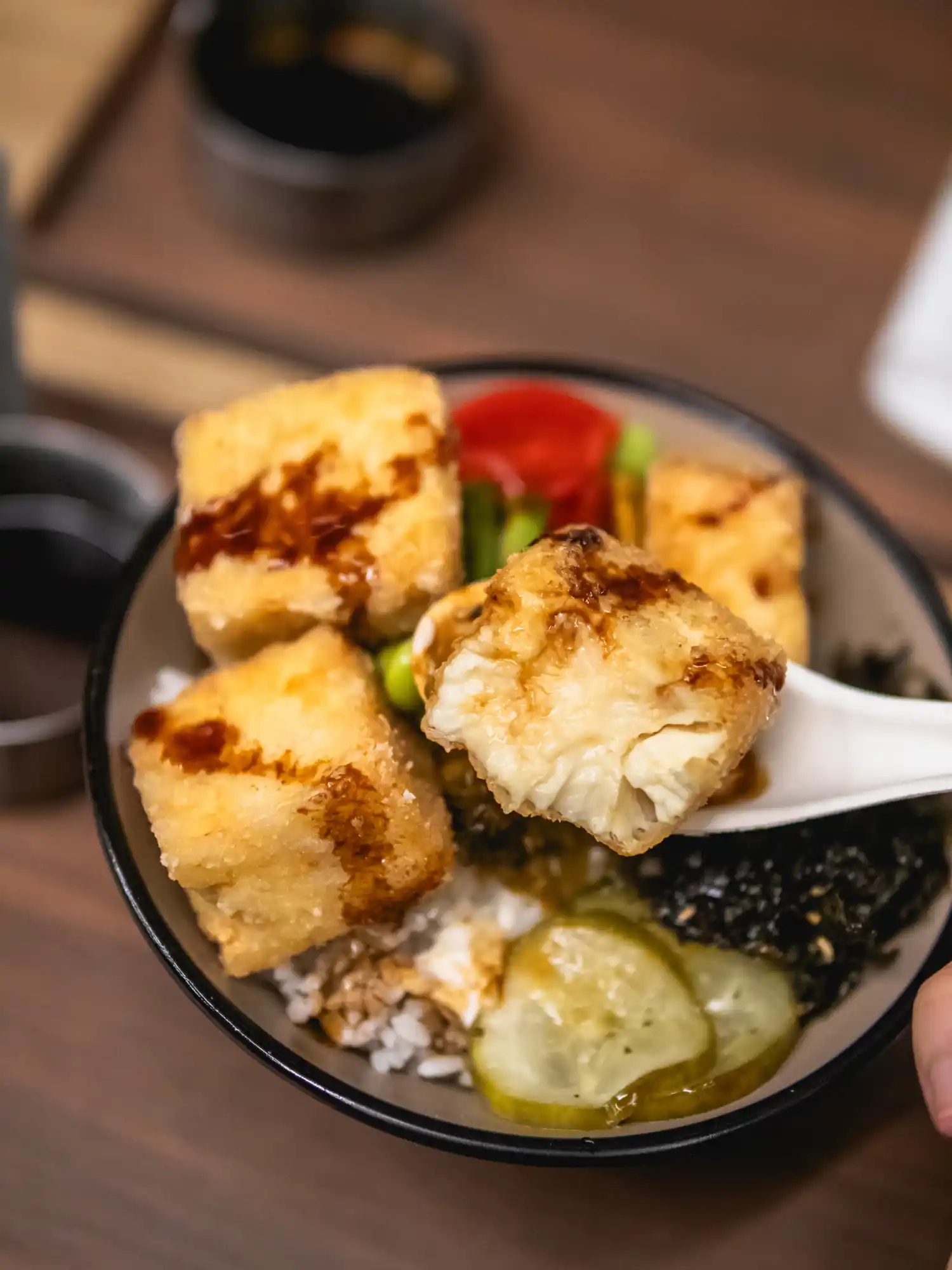 I had the teriyaki tofu donburi $16, and it was pretty delicious, though I was surprised of its small size. It comes with four pieces of tofu that have a great smooth texture, served over rice with seaweed, edamame, pickles and more.