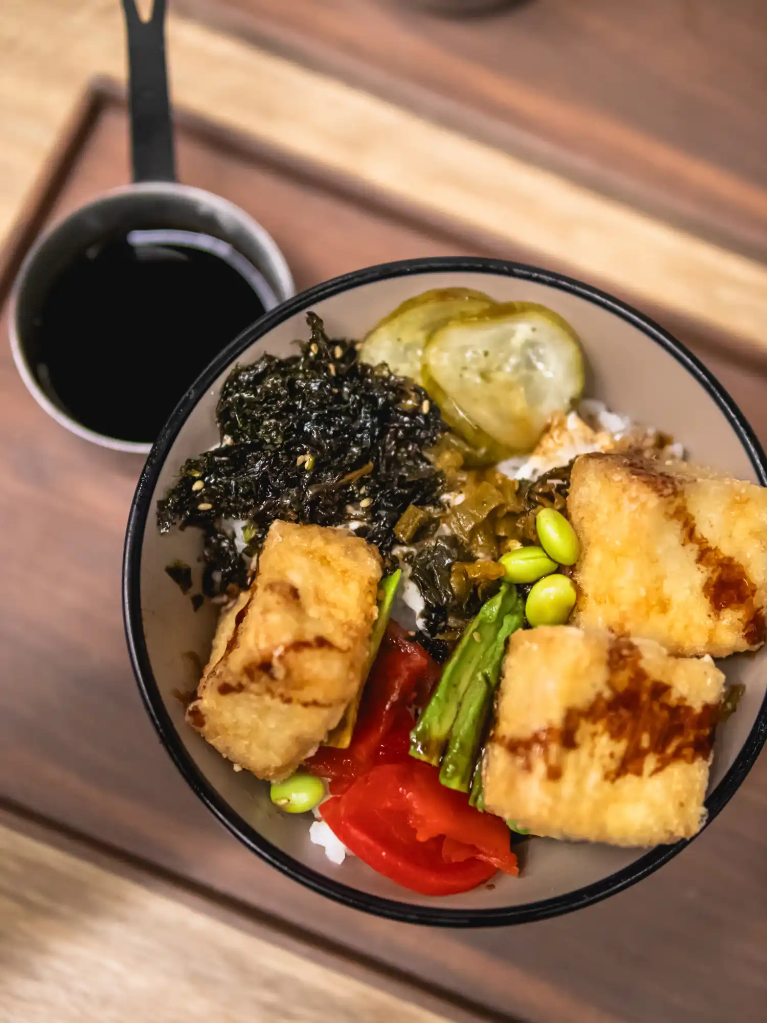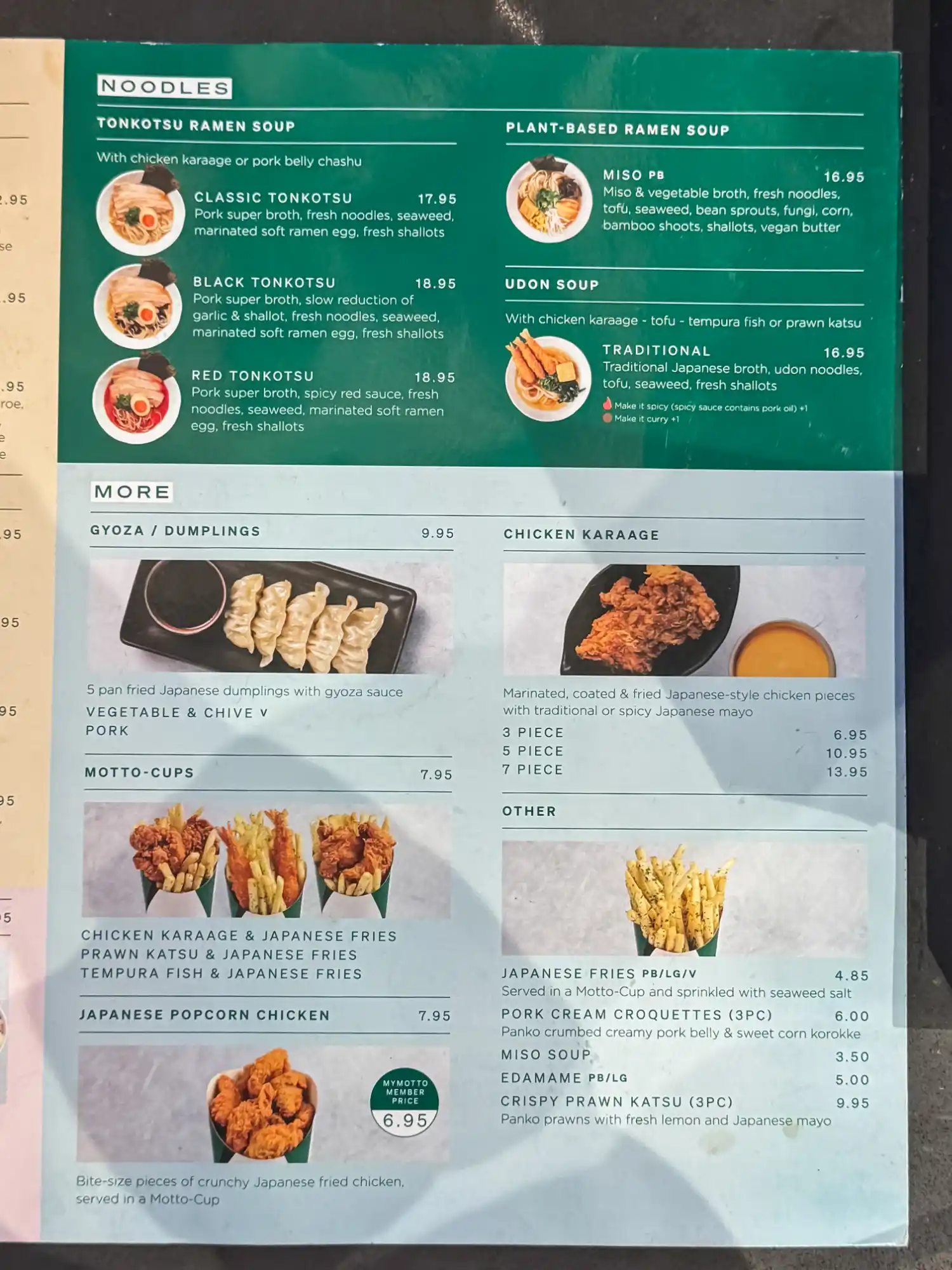 Motto Motto has two main vegan offerings - the teriyaki tofu rice bowl and the miso ramen (the tofu curry rice has dairy and is not vegan).